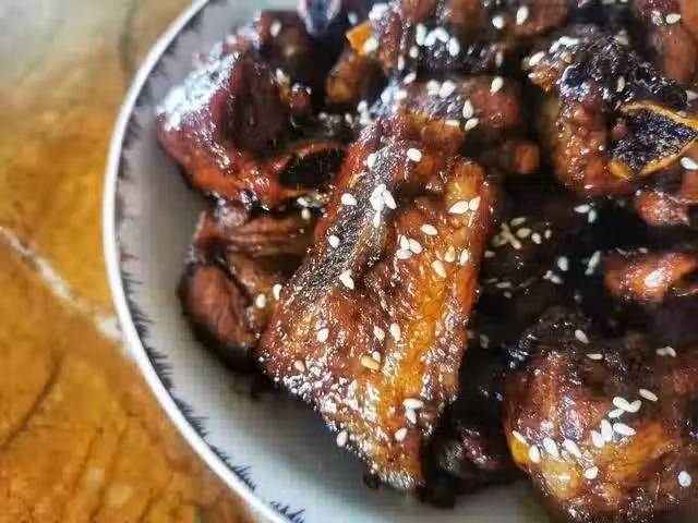 排骨2斤、生薑1塊、蒜3瓣、蔥1截、料酒2勺、冰糖1把、老抽2勺、生抽2勺、鹽適量、熟白芝麻少許。
