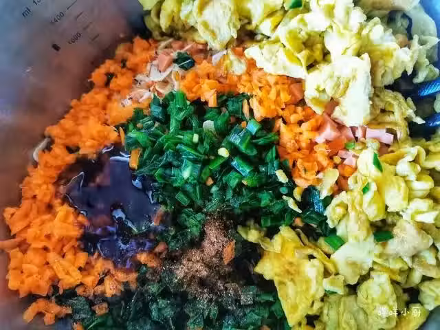 4、向餡兒料中加入胡椒粉、五香粉、蚝油和鹽一起攪拌均勻,餡兒料就做好了。