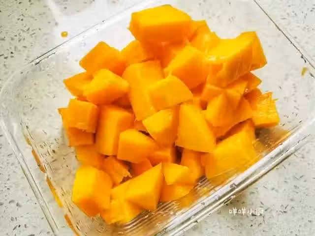 4、放入適量的芒果丁,攪拌一下倒入準備好的容器中。(我一個大芒果只用了一半。)