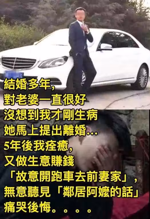 結婚多年,對老婆一直都很好, 沒想到我才剛生病,她馬上提出離婚…5年後我痊癒,又做生意賺錢「故意開跑車去前妻家」,無意聽見「鄰居阿嬤的話」痛哭後悔