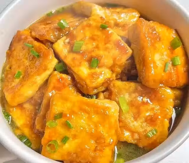 (3)嫩豆腐均勻地裹上一層蛋液,下入熱油鍋中,小火慢煎至兩面金黃色。
