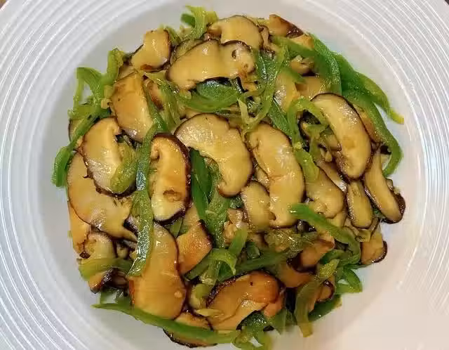 2、起鍋熱油,蔥蒜末爆香,倒入香菇翻炒均勻加入2勺生抽、1勺蚝油、少許鹽、少許雞精炒至入味,最後倒入青椒絲,翻炒均勻,淋入少許香油即可。