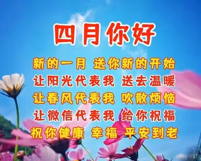 4、新的一月,送你新的開始,讓陽光代表我 送去溫暖,讓春風代表我 吹散煩惱,讓微信代表我 給你祝福,祝你健康 幸福 平安到老,4月你好