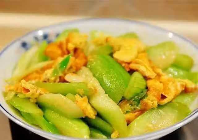 4、猛火將炒鍋加熱入油,待油溫升高,倒入絲瓜炒熟,加入已熟雞蛋同炒。