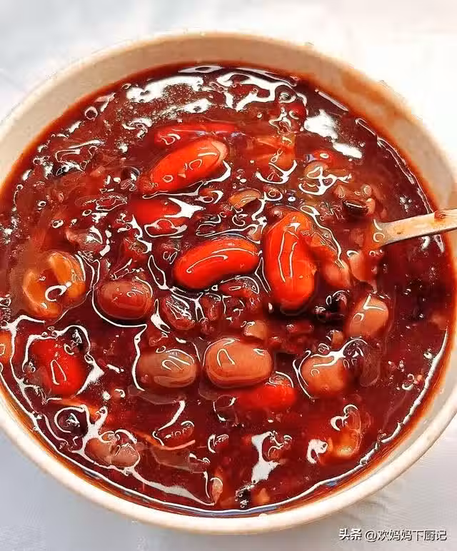 第三步:泡好的紅豆、黑米、糯米、適量清水放入砂鍋里大火煮開小火煮1小時,要注意攪拌