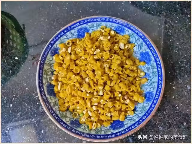 酸豆角過一遍涼水之後切成小顆粒,另外再準備2勺香而不辣的剁辣椒,想要河粉炒得好吃,酸豆角和剁辣椒是必不可少的哦。