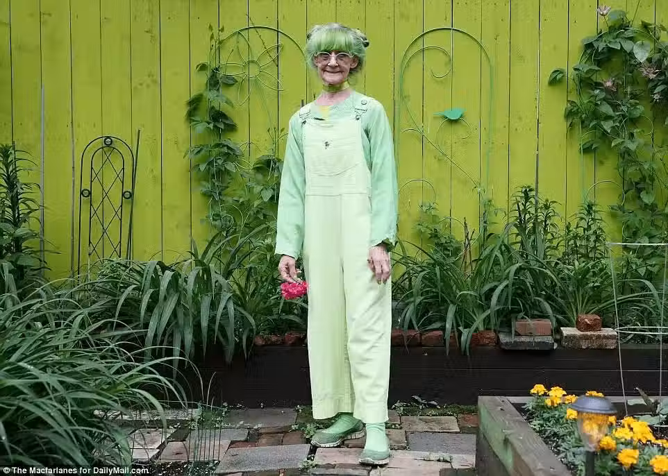 「綠色是一種積極的顏色,它讓人開心,即便在陰雨天也一樣。」於是,綠色女士一點一點的開始增加「綠色濃度」,直到整個人都變成綠色為止。