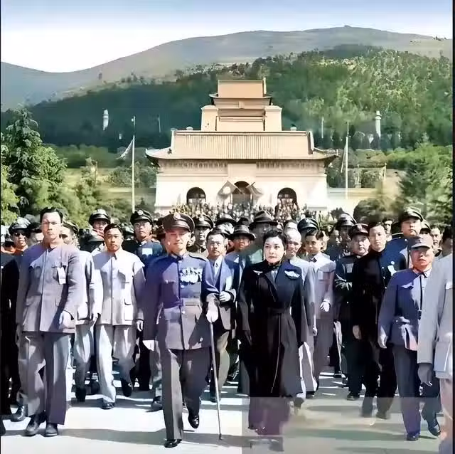 1946年,宋美齡和蔣介石帶領國民黨要員祭拜中山陵的罕見合影。經過長達14年的浴血奮戰,中國取得抗日戰爭的勝利,蔣介石決定把首都從重慶遷南京,並祭拜了孫中山先生。