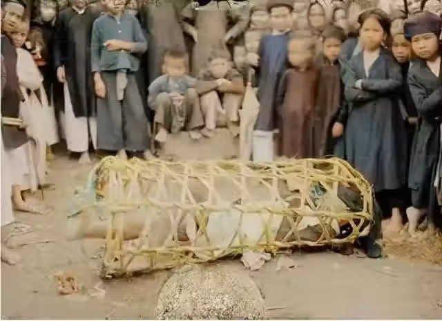 這是一張晚清老照片,照片中一名年輕女子被捆綁放進豬籠里後,放倒在地上,她面臨的將是殘忍的豬籠刑,會被活活淹死。再看周圍站滿的圍觀民眾,他們滿臉冷漠、神情麻木,早已對豬籠刑早已見怪不怪了,或者說他們對於這樣的刑罰早已習以為常。