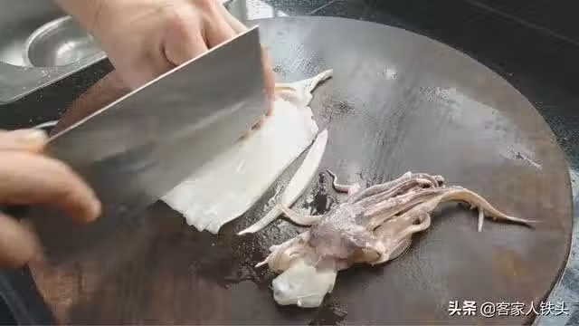 第二步:鍋中下油,油熱後倒入魷魚,把它煸香,然後加上點料酒,繼續翻炒,炒香後把魷魚碎剷出來,放涼。。。