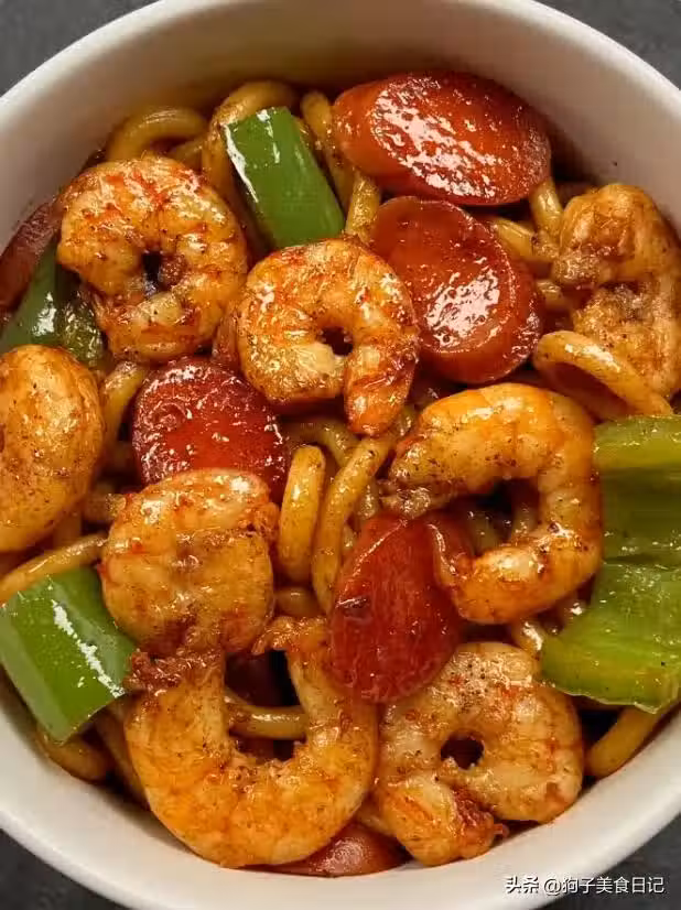 材料:烏冬面,蝦仁,火腿,青椒,秘制料汁。