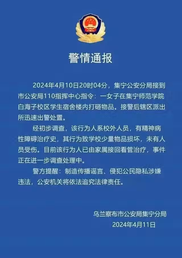 警方公布了調查結果:該女子是校外人員,有精神病史,目前已由家屬接回看管。