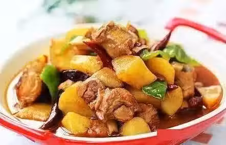 食材:小公雞半隻、土豆1個、洋蔥1/2個、胡蘿蔔1/2個、青椒2個、蒜瓣6個、茭白1個、八角1個、干辣椒5個桂皮、1塊花椒、1/2湯匙香葉、1片姜、1塊蔥1棵、鹽2茶匙、老抽1湯匙、生抽2湯匙、料酒1湯匙、五香粉1/2茶匙、味精1/2茶匙