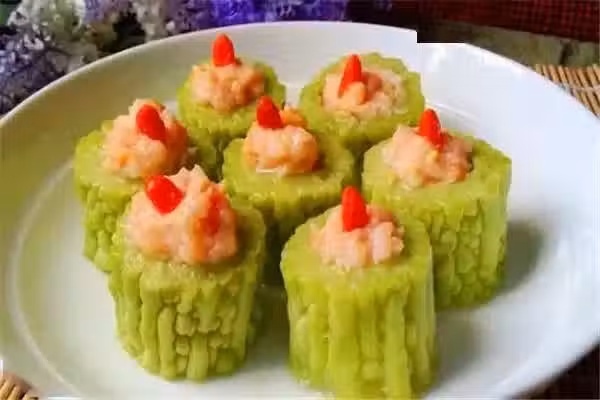 準備食材:苦瓜、鮮蝦、香油、薑汁、雞精、鹽、枸杞各適量。