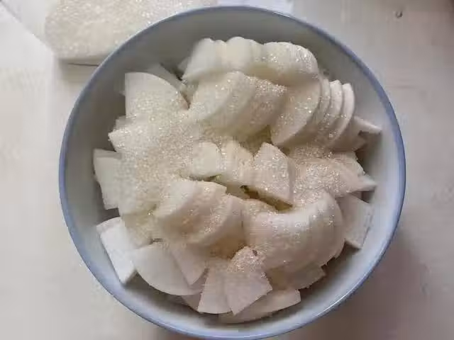 4、大約3個小時後,蘿蔔已滲出大量水分,把水倒掉,再用純凈水沖洗一遍蘿蔔,然後控干水分。。。。。。。。。。。。