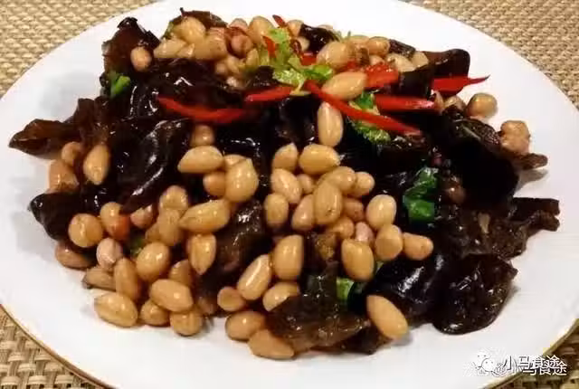 2.拌菜盆中加入處理過的木耳,調入少許鹽、味精、香油拌勻,再加入一勺鹵熟的花生米,加入紅椒絲和香菜段,翻拌均勻即可裝盤。