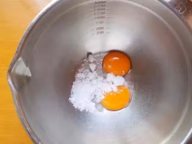 2、一直打發到蛋黃體積膨大,顏色有點泛白後,加入15克的玉米澱粉,然後轉中速攪打均勻待用。這裡玉米澱粉也可以其它澱粉替代