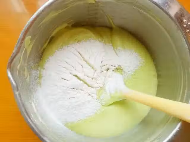 14、把混合好的菠菜蛋糕糊倒入6寸圓模內,因為今天我用的是活底圓模,所以在外圍包裹了2層錫紙,這樣可以防止蛋糕底部進入過多的水蒸氣,從而導致成品底部過濕或有布丁層的現象