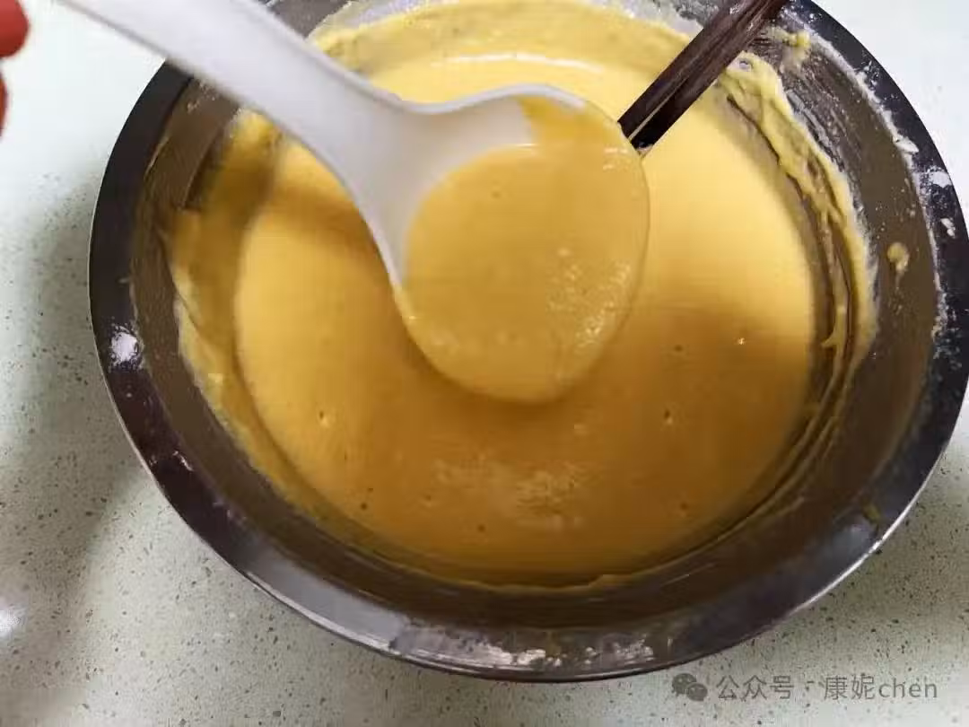 第七步:將玉米面糊攪拌一下,取出一勺麵糊放入平底鍋。