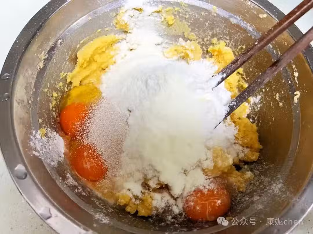 第三步:等玉米面溫度降到室溫,加入中筋麵粉、雞蛋、奶粉、砂糖和酵母粉,用筷子攪拌均勻。