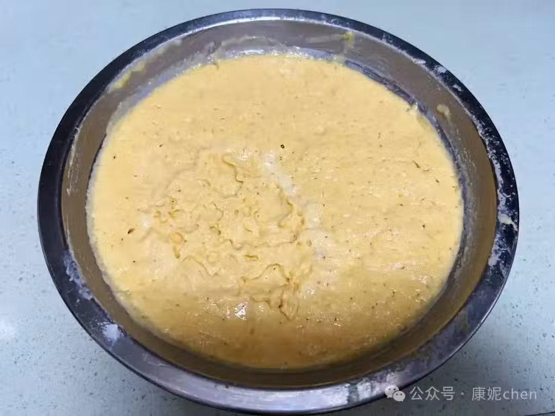 第六步:玉米面糊已經發酵完畢,內部呈現出蜂窩狀結構。當前溫度較高,大約30分鐘的發酵時間即可達到圖片所示的狀態。若想縮短髮酵時間,有兩個可行方案。第一個方法,可以考慮將酵母粉替換為泡打粉。第二個方法,若仍使用酵母粉,可提前一晚攪拌好麵糊,並放入冰箱冷藏進行發酵,第二天早晨再取出使用。