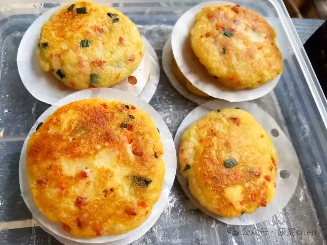 第五:土豆餅可以一次多做一些,放在冰箱冷凍保存,想吃土豆餅從冰箱取出,用空氣炸鍋加熱一下。