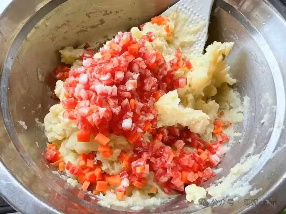 第五步:加入胡蘿蔔丁和臘腸丁,攪勻。