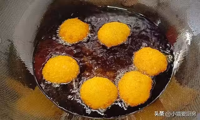 【步驟九】:南瓜餅炸飄起來,然後開大火炸20秒鐘,把南瓜表面炸至金黃酥脆,撈出來把油控干裝盤就可以了。
