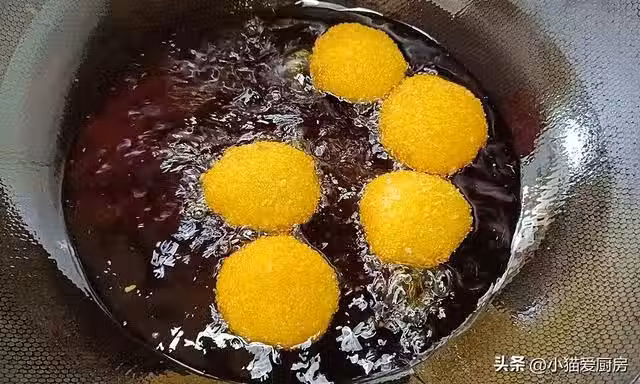 【步驟八】:等南瓜炸定型,開中小火繼續浸炸,把南瓜餅炸熟。