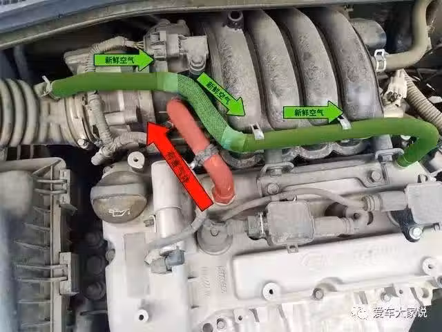 (4)曲軸箱通風系統有一根補充新鮮空氣的管子