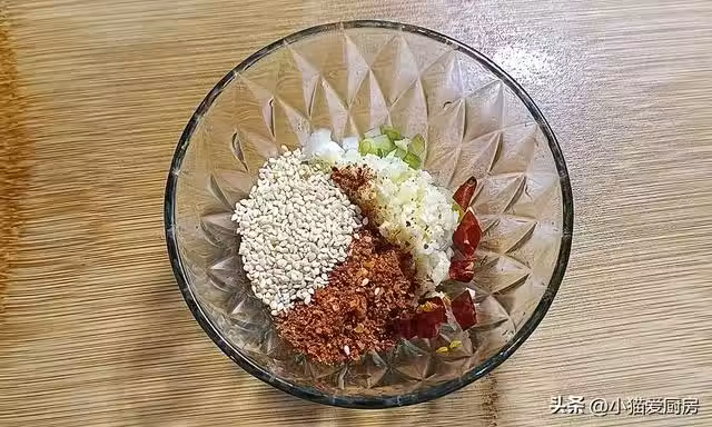 【步驟六】:鍋中放入一勺油燒至冒煙,澆入調料碗中,把調料的香味激發出來。