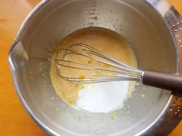 4、接著再把低筋麵粉和泡打粉過篩進來,用手動打蛋器攪拌到細膩無疙瘩的狀態。