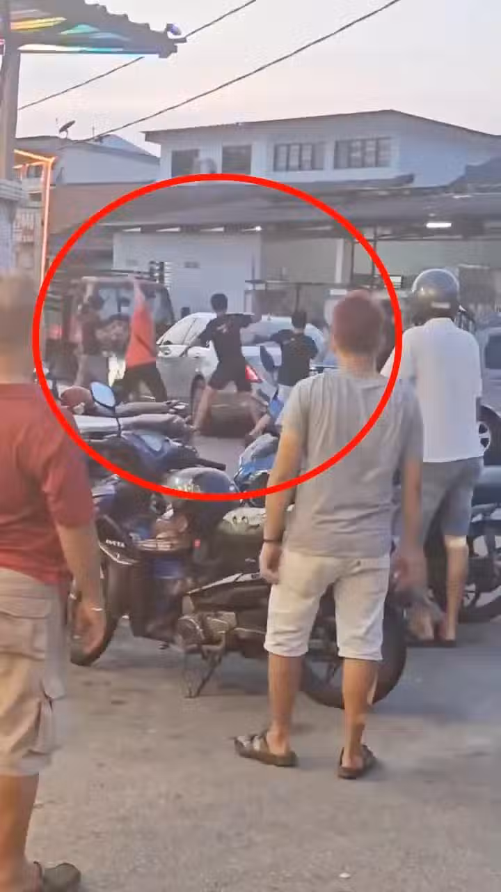 社交媒體流傳一組視頻畫面,畫面中逾10名黑衣及紅衣的青年,手持巴冷刀,在位於拉惹烏達國花園巷第二條路一帶劈砍一輛銀色馬賽地轎車。