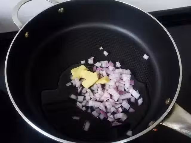 4、等能明顯聞到洋蔥的香味後,將排骨瀝干水下鍋,用大火爆炒,一直炒到排骨變色為止。