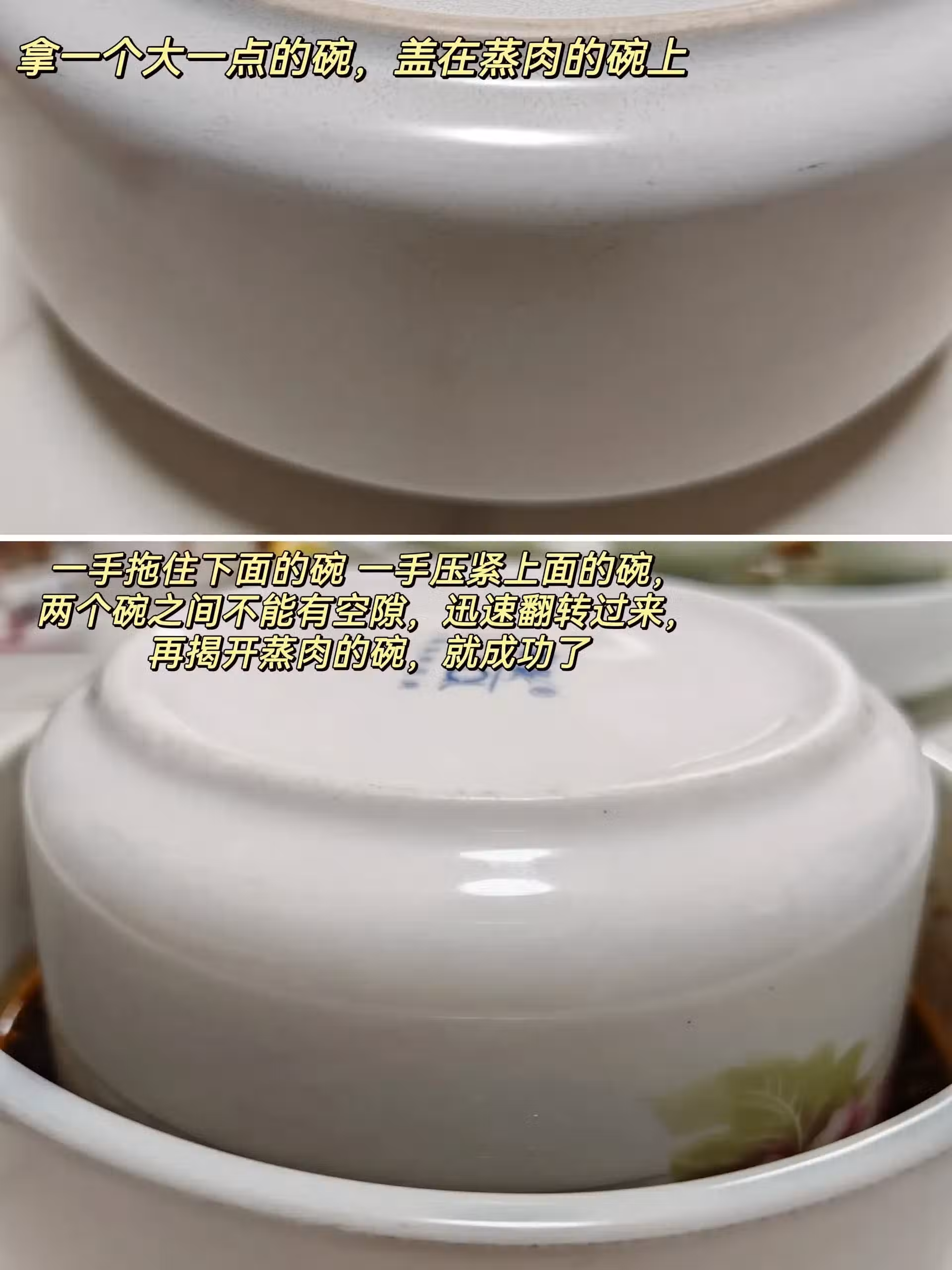 4、最後一步就是扣肉了,這可得小心點兒,別把這辛辛苦苦蒸好的肉給弄散了,得拿一個大一點的碗蓋在蒸肉的碗上,然後一手托著蒸肉的碗,一手緊緊壓住蓋著的碗,迅速翻轉過來;再小心翼翼地切開蒸肉的碗,嘿,這茄子干蒸扣肉就大功告成了!