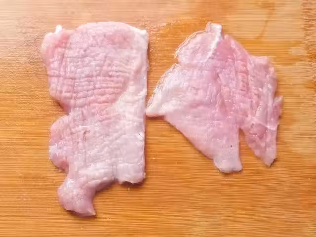 2、接著把黑胡椒粉、花椒粉、鹽焗雞粉和鹽倒在豬肉片上,塗抹均勻,腌制10分鐘。