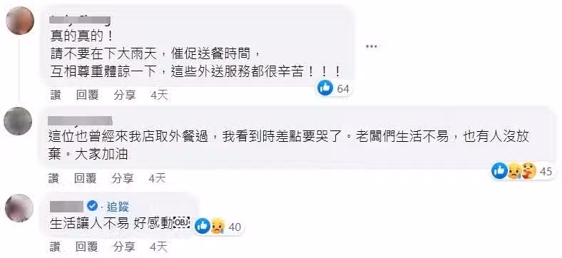 這篇文章在短時間就吸引5000多人按讚,很多網友紛紛留言為他打氣:「自食其力,這樣的態度令人動容」、「勇敢的先生加油!」「大雨就不要催單了,體諒外送員的辛苦!」「這位也曾經來我店取外餐過,我看到時差點要哭了。」「好堅強的正能量!」「他的生命力給了我很多啟發!」看來這位外送員堅強的身影,帶給很多人很深的感觸與啟發呢!