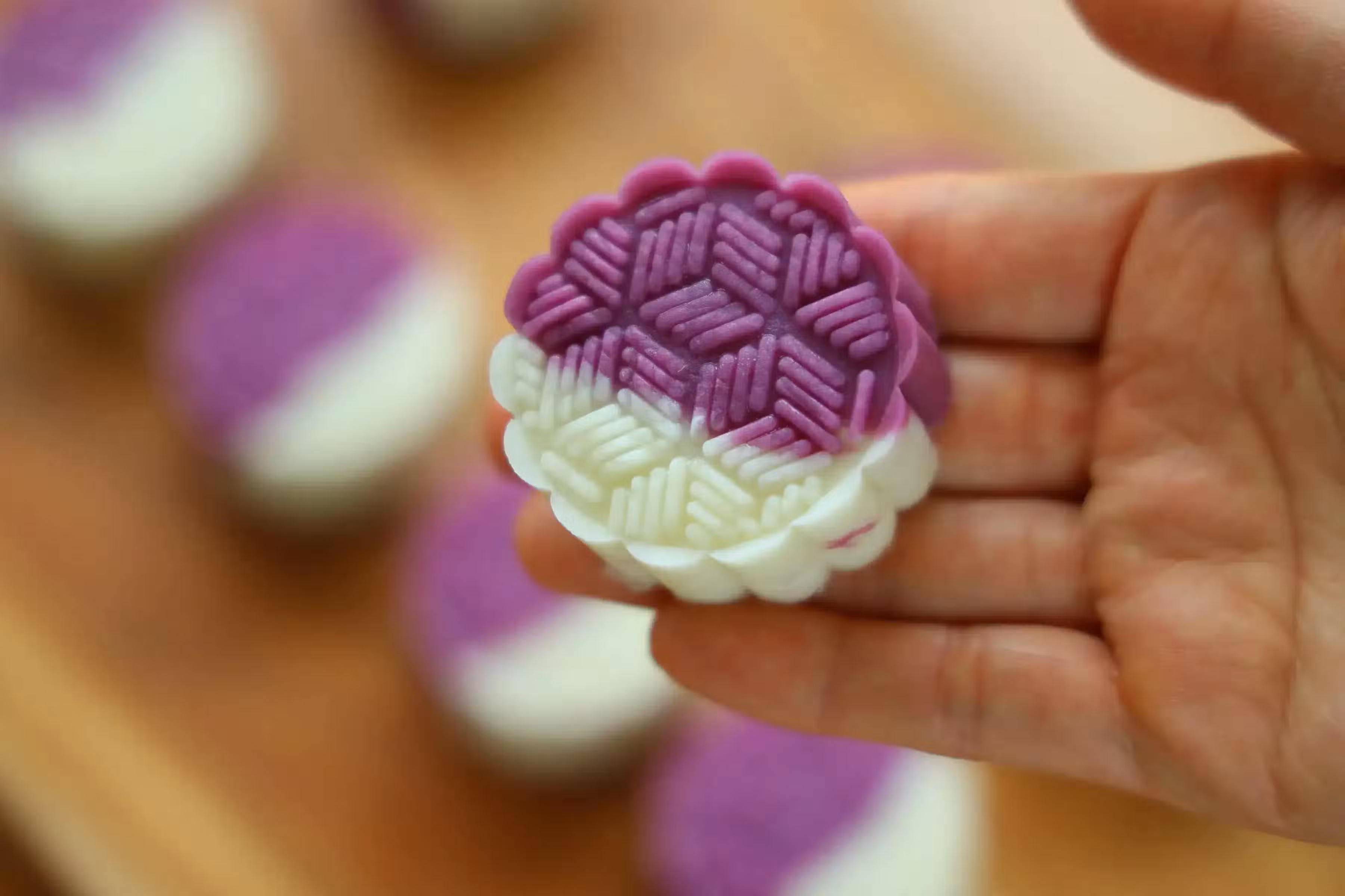 製作這款糕點,就像是在進行一場藝術創作。我們用心地將麵糰糅合在一起,輕輕地包裹住草莓醬,然後搓圓,放入小月餅模具中,輕輕一壓,一個完美的草莓流心山藥糕就誕生了。