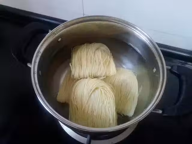 3、將煮好的雞蛋面撈出,過一下涼水,然後再控干水分,倒入適量的食用油,翻拌均勻待用,這樣可以防止麵條粘成一坨。