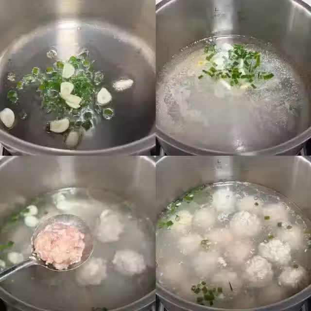 4、等丸子定型之後,再慢慢推動,就可以徹底煮開了,把浮末打掉,丸子煮個7-8分鐘就可以了,把豌豆苗加進去,煮開即可關火。