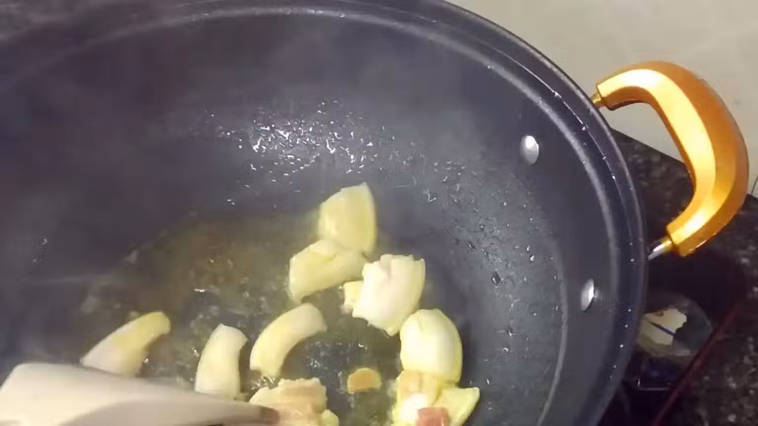 3、冷鍋燒熱,倒入少許食用油;滑動一下鍋,防止粘鍋;待油溫燒至約5成熱時,下入五花肉片,轉小火煸炒,將五花肉的油炒出來;當五花肉炒至微微發黃呈半卷狀時,下入蒜子,炒出蒜香味;炒香後加入少許醬油上色,再加入適量清水或純凈水。