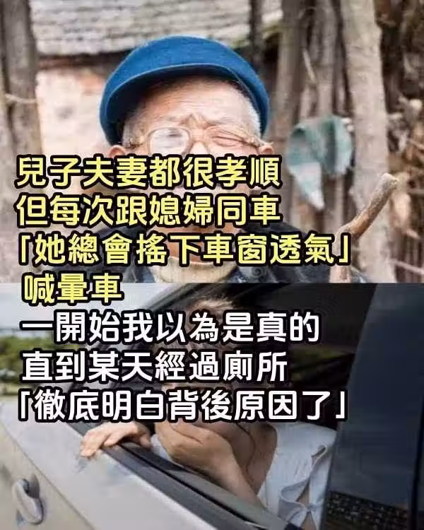 兒子夫妻都很孝順!但每次跟媳婦同車「她總會搖下車窗透氣」喊暈車 一開始我以為是真的,直到某天經過廁所「徹底明白背後原因了」