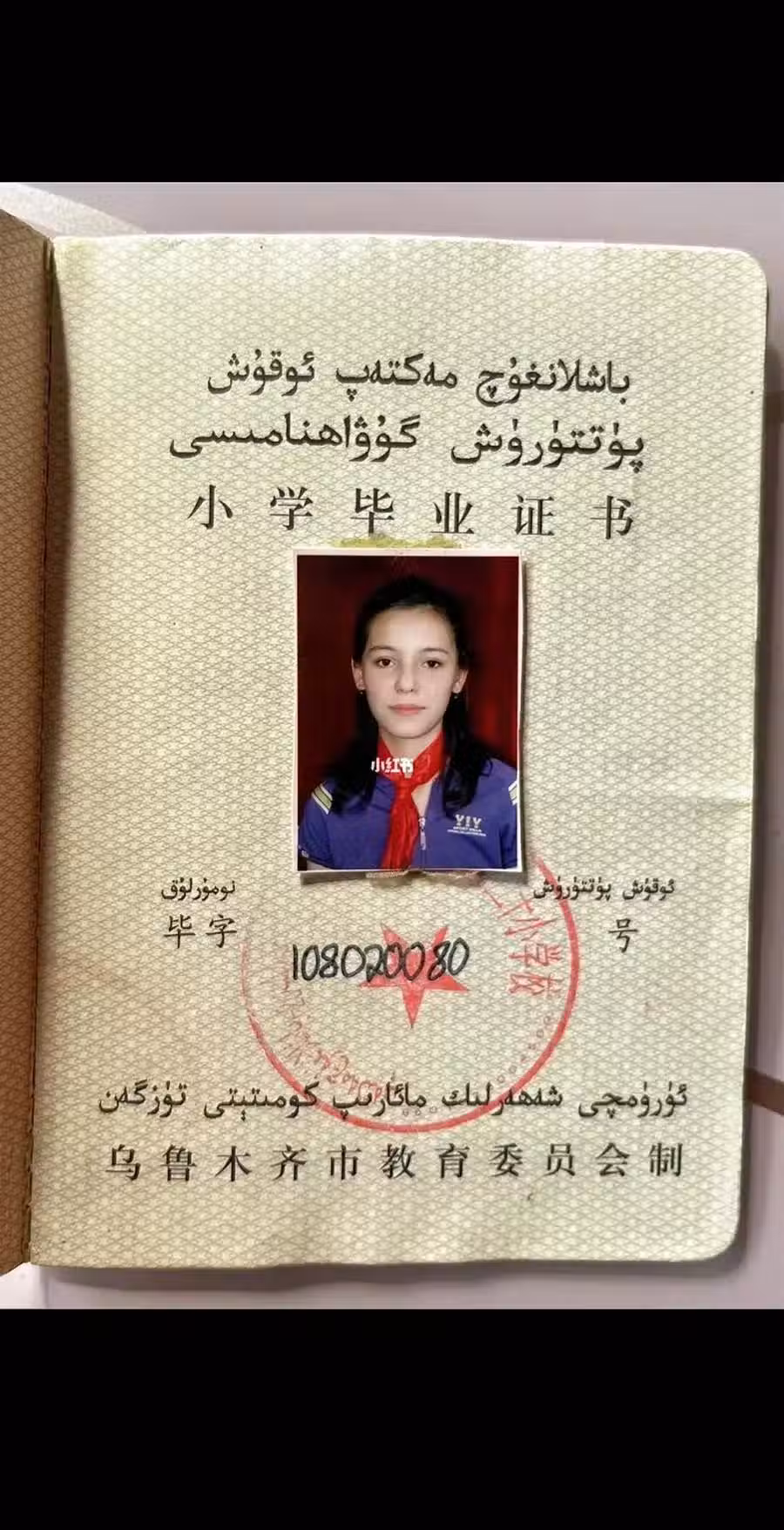 第一張照片顯示的是她的小學畢業證書,證書上的照片展示了一個年輕的面孔,擁有明亮的眼睛和清新的氣質,即使是在那麼小的年紀,也能看出她的顏值非常高。畢業證書上的文字和圖案增添了一種正式而紀念的感覺,但最吸引人的無疑是中間那張精緻的面孔。