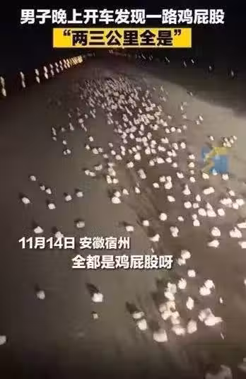 孔先生表示, 一路走下來有3公里長的距離,都是散落的雞屁股,而且有些已經被過往車輛碾爛。孔先生說,當時他並未報警,次日,再去事發地查看,路上已無雞屁股。