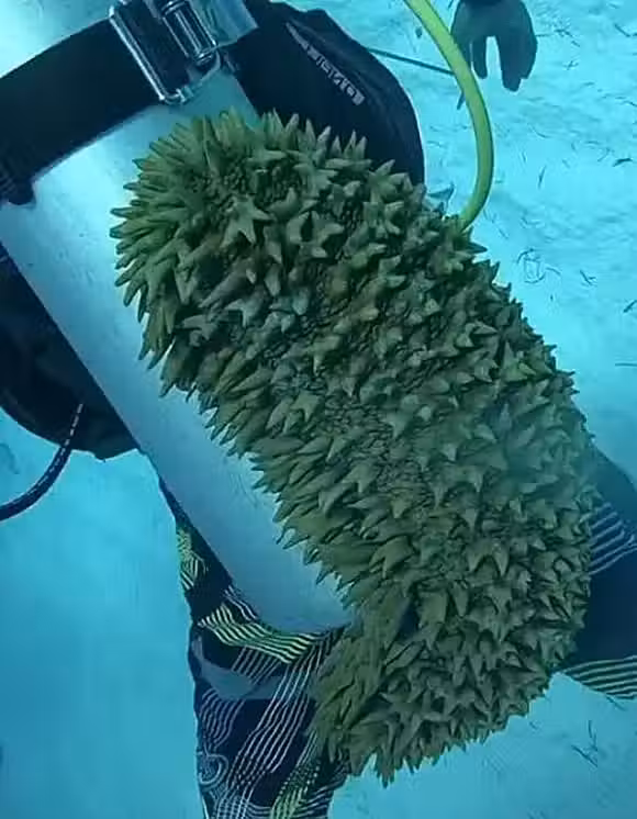 朋友看見女子的氧氣瓶上趴著一坨很大的海參,只見它牢牢地趴在了女子後背。女子正要伸手把海參弄下來,卻被朋友給制止了。朋友說海底的生物可不能亂碰的,而且這個海參身上都是刺,要是被扎傷了可不好了。