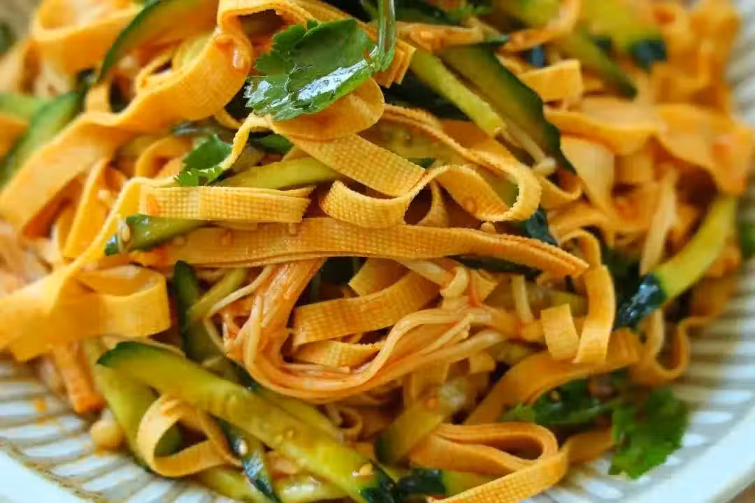 品嘗這道涼拌豆皮金針菇,首先感受到的是豆皮的韌勁與金針菇的滑嫩,在口中交織出美妙的口感。黃瓜的清爽與香菜的香氣則恰到好處地中和了醬汁的濃郁,讓人在享受美食的同時,也感受到一絲夏日的清涼。