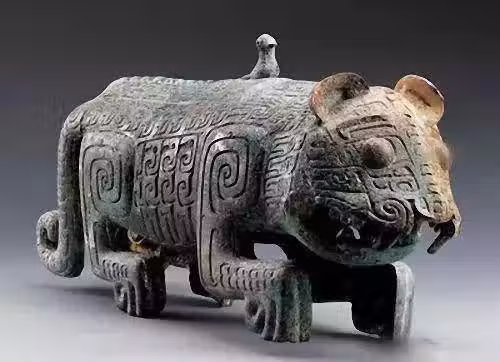 該器通長53.5厘米,通高25.5厘米,體寬13.0厘米。銅虎體態蓄勢待發,盡顯王霸氣像。虎後長著兩只尾巴!
