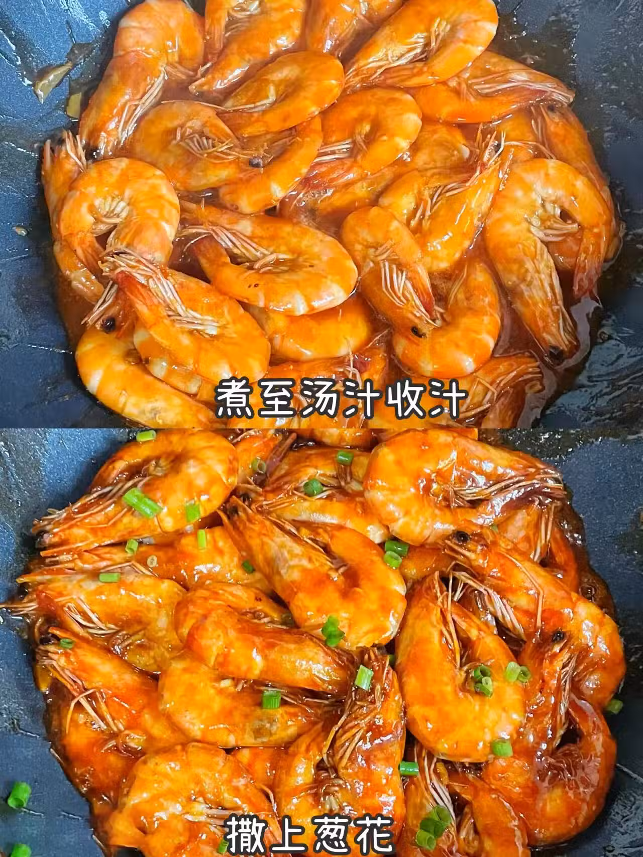將煎炒好的茄汁大蝦盛入盤中,撒上一些切好的蔥花作為點綴。