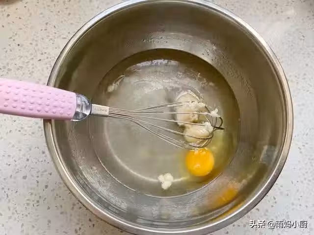 4、把食用小蘇打和低筋麵粉放入盆里,先用打蛋器攪拌至無乾粉。