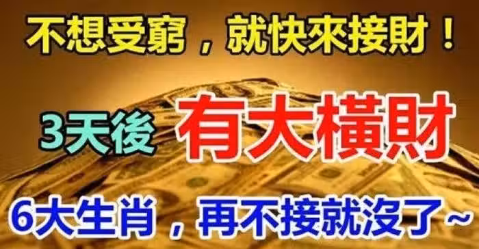 不想受窮就快來接財,三天後有大橫財,六大生肖再不接就沒了